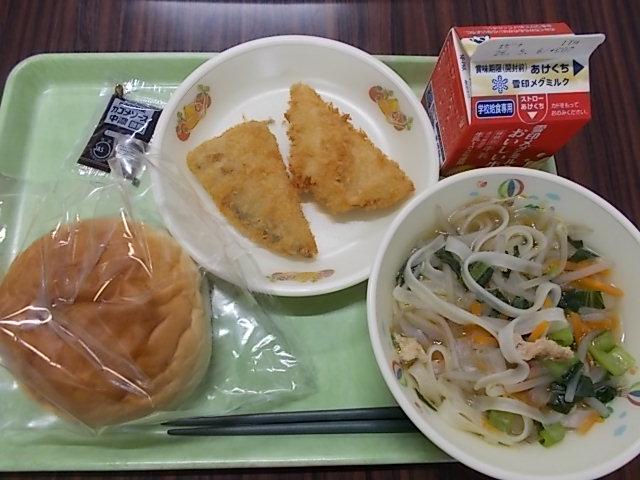アジフライは身が柔らかく衣がサクサクで食べやすく、フォーのスープは旨みがあり麺の食感も良かったです。パンオーレは、もちもちでほんのり甘く、全体としてバランスのとれた献立でした。