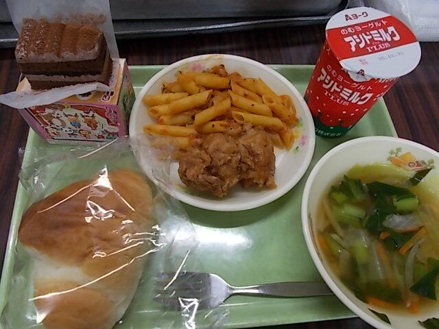 ロールパン 発酵乳 甘辛フライドチキン ペンネアラビアータ 野菜スープ お楽しみデザート