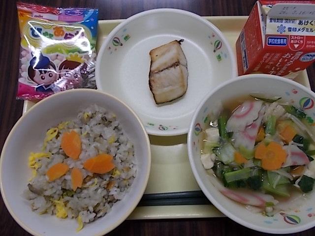 ふきよせご飯 牛乳 魚のカレー揚げ かぶの味噌汁