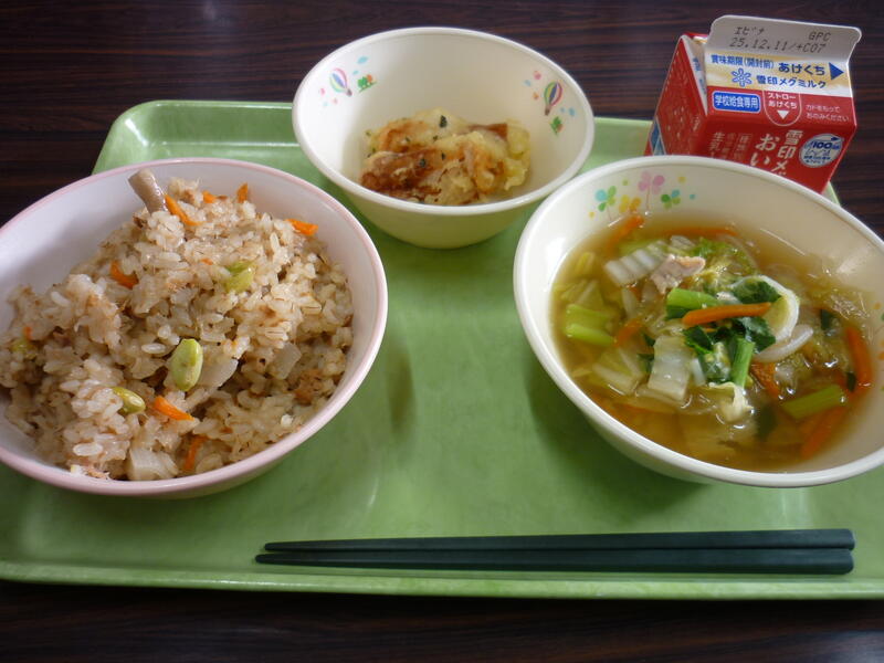 ふきよせご飯 牛乳 魚のカレー揚げ かぶの味噌汁