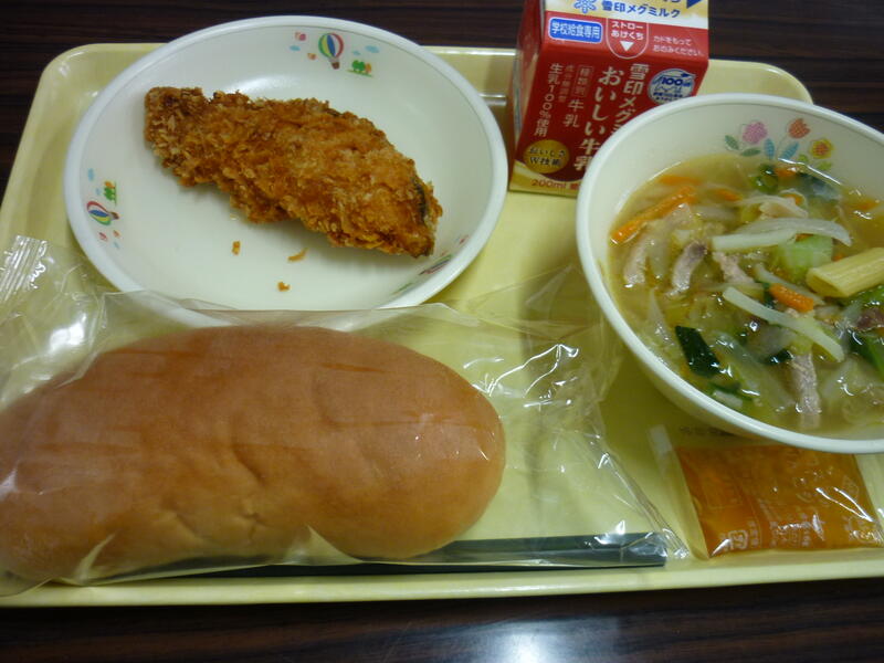 魚のかわりフライ ペンネスープ コッペパン りんごジャム 牛乳さかなのかわりフライはコーンフレークとパン粉が衣として使用されており、サクサク感が際立っていました。ソースなどの味付けはなくても魚本来の味とコーンフレークの塩味と食感を楽しむことができました。フライの塩味と対照的なりんごジャムの甘さがコッペパンにとても合っていました。