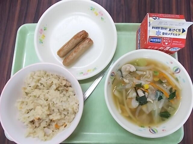 チキンピラフ 牛乳 ウインナーソテー 野菜スープ