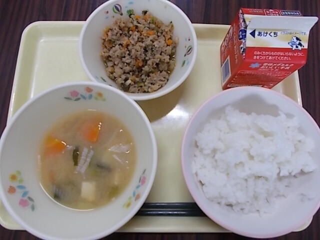 ご飯 牛乳 高菜そぼろ丼 味噌汁