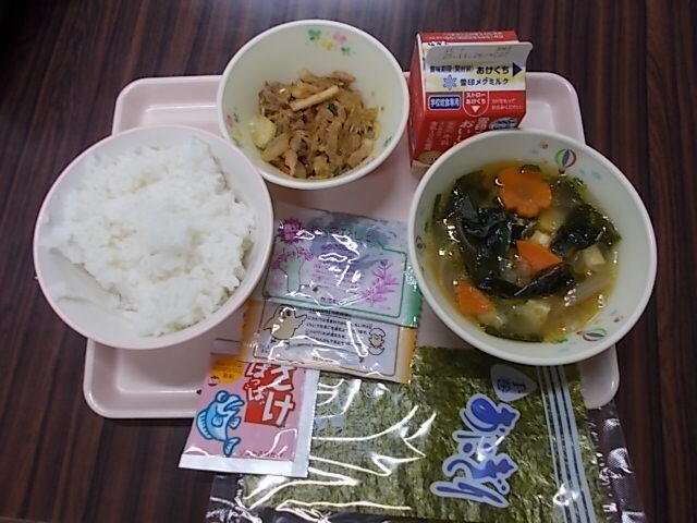※画像の「ふりかけのさけ」や「のり」は、ランチルーム給食で出されたものです。5年ぶりにランチルーム給食を再開し、今日は4年3組でした。一クラスずつ順番に行います。