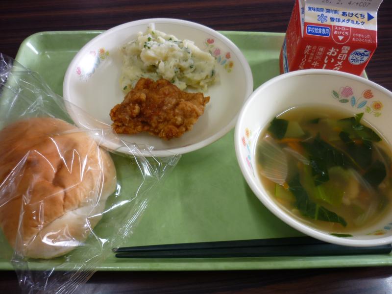 ロールパン 鶏肉のレモンソース ミルクポテト パスタスープ 牛乳