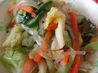 座間産の野菜(白菜・人参・小松菜)のたっぷり入った野菜の甘さを感じるスープでした。チャプチェはご飯の進む味付けでした。