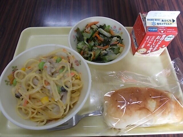 チーズパン 牛乳 ホワイトスパゲティ 海藻サラダ