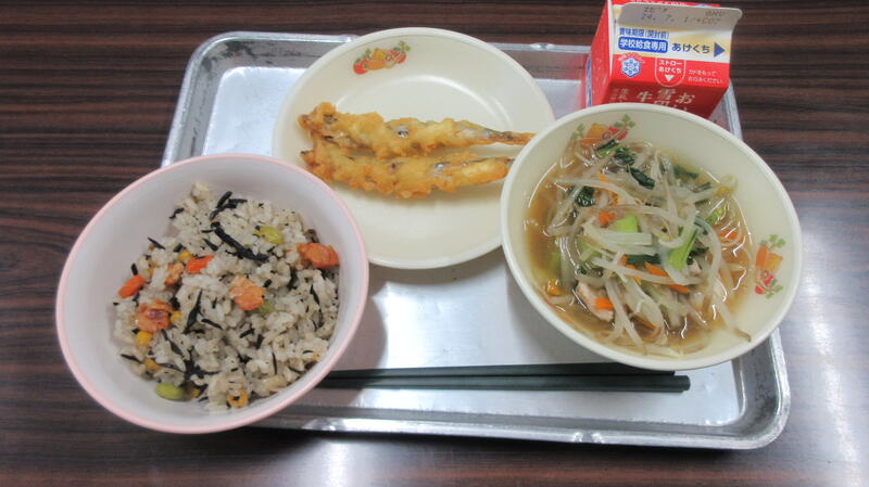 ごもくごはんは、味付けが良くとてもおいしかったです。みそ汁は,出しがよくでていて香もよくごもくごはんとよく合っていました。コロコロ磯辺揚げは,カツオがからりと揚がっていて,青のりがアクセントになっていました。