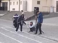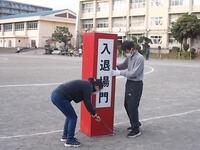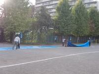 出来る限り、土曜日の運動会と同じ環境で開催できるようにと、いちど片付けた入場門や座席のブルーシート、杭打ちロープ張り、スローガン等の掲示物の準備を職員で行いました。
