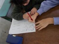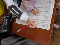 1年生は、算数「引き算」のやり方を5年生に説明し、正しく説明できていたら花丸をもらっていました。5年生は1年生に「すごいね!」「よくできているね。」などと上手に褒め、1年生のやる気を引き出していました。
